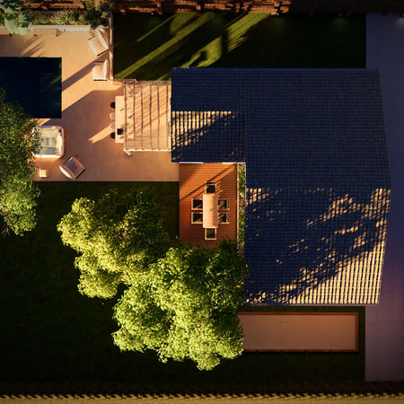 Pour finir, l'ensemble de la maison est clos par une barrière en bois à hauteur variable et l'ensemble de la propriété est mis en valeur par des éclairages.
